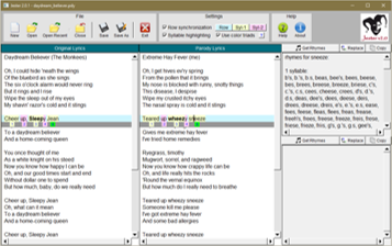 • Displays a line-by-line comparison of original and parody lyrics syllable counts, color-coded to indicate where parody lines have too few or too many syllables